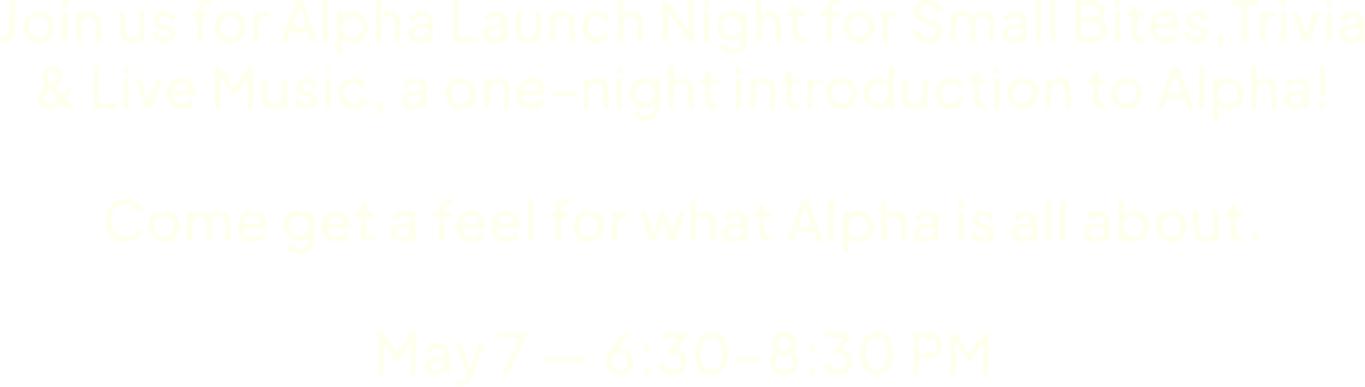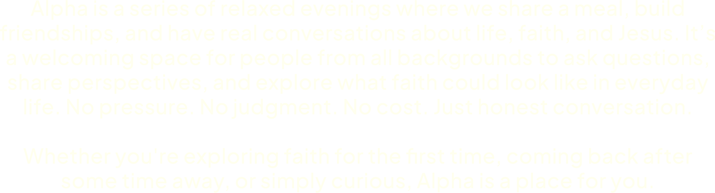 Alpha is a series of real conversations about life, faith, and the journey we're all navigating. It’s a space to ask honest questions, wrestle with doubt, and explore what it all means in a welcoming and pressure-free environment. Whether you're skeptical, curious, carrying real hurt, or simply looking for a place to talk about the things that actually matter, you're welcome at the table.
